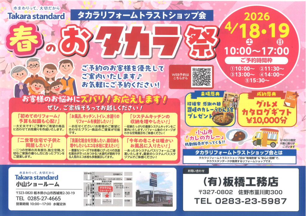 春のおタカラ祭 2026.03.31 佐野市堀米町F様邸完成・暮らすやすさとデザイン性を両立した住まい 2026.03.31 佐野市犬伏新町A様邸完成・HEAT20、断熱性能6 2026.03.31 エステサロンオープン 2026.03.12 麵屋板橋 オープン 2026.01.22 春のおタカラ祭 お知らせ 2026.03.31